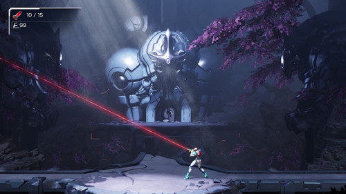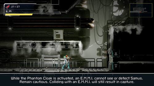 Mens du beveger deg rundt på det aldeles nydelige metroidvania-kartet, og låser opp stadig mer av en stadig farligere verden, beveger du deg inn i soner som har blitt overtatt av en E.M.M.I. Sikten blir tåkete, musikken demper seg og du er plutselig låst i en livsfarlig katt-og-mus-lek som automatisk resulterer i game over hvis roboten fanger deg.