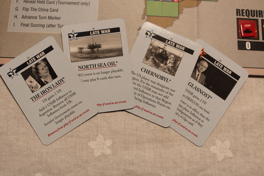 Omgangene foregår ved at spillerne spiller et og et kort fra hånden sin, enten for å innkassere innflytelsespoengene fra kortet eller aktivere hendelsen. Hvert eneste kort har en historisk hendelse som enten er gunstig for Sovjetunionen eller USA. For eksempel kan Fidel Castro ta makten på Cuba, Brezhnev-doktrinen kan tre i kraft eller en gisselkrise kan oppstå i Iran. Alle disse hendelsene er basert på faktiske historiske hendelser og er til fordel for Sovjetunionen i form av at de gir Sovjetunionen økt innflytelse eller USA redusert innflytelse i spesifikke områder.