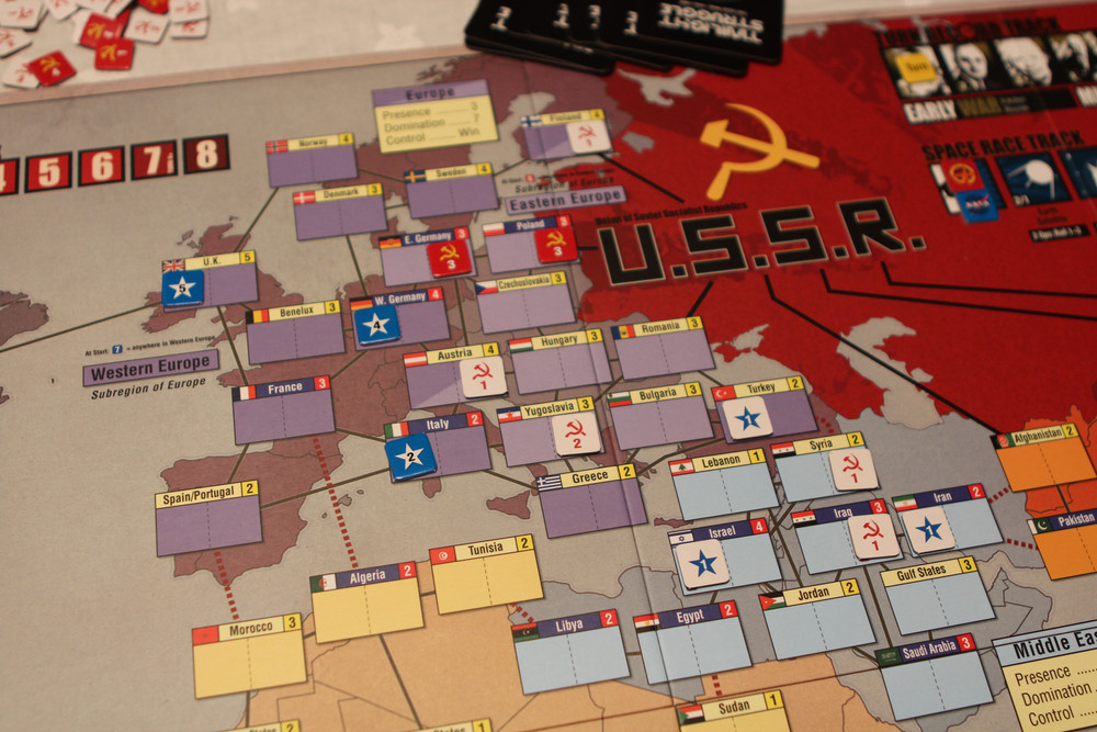 Dette legger selvsagt motstanderen din merke til. Når han ser at du plutselig begynner å bygge opp innflytelse i Midt-Østen vil han umiddelbart mistenke at du har poengkortet for Midt-Østen og dermed begynner han med å bygge opp sine egne styrker der og ta tilbake kontrollen. Det er den kalde krigen i et nøtteskall og briljant konseptualisert via elegante spilleregler.