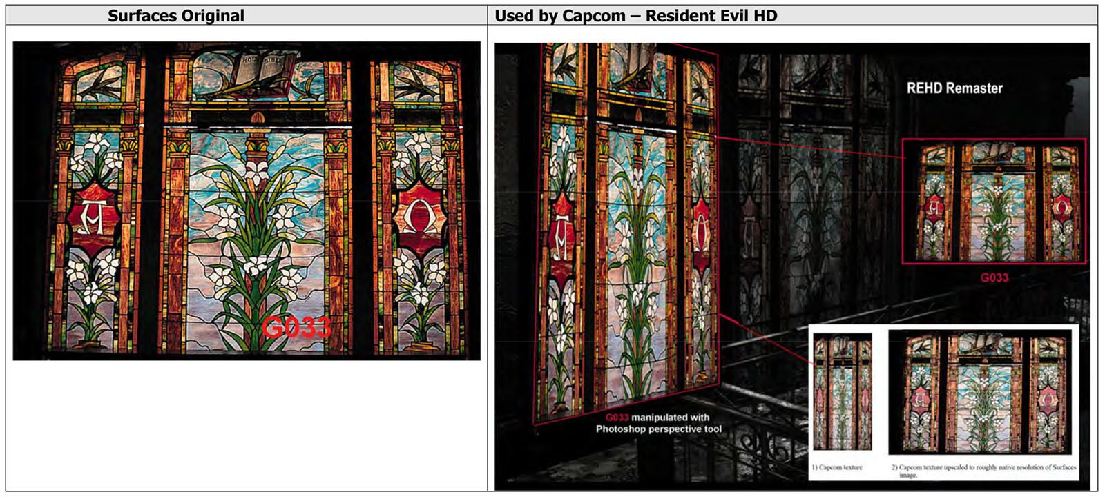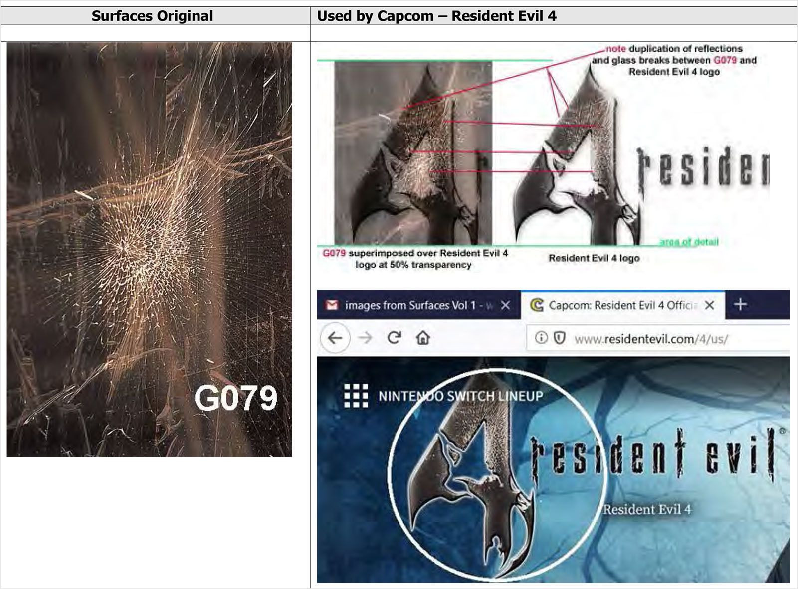 Søksmålet legger frem hvordan designeren har funnet igjen flere teksturer i spill som Resident Evil 4, Devil May Cry og andre spill, som skal være rappet fra hennes bok Surfaces. Surfaces er en bok fra 1996 med 1200 foto av forskjellige overflater – målet med verket er å la kunstnere og designere la seg inspirere av overflatene. Man kan dog ikke bare plukke bildene ut fra boken og bruke uten å skaffe seg en lisens for bruken, noe Juracek hevder Capcom ikke har gjort.