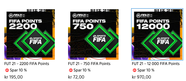 Departementets vurdering er forståelig, men dårlig. Premien har kanskje ikke en direkte verdi i seg selv, men det hindrer ikke selv EAs egne ansatte i å tjene gode penger på å selge ettertraktede FUT-kort. De mest populære FUT-kortene kan være vanskelig å få tak i; i et forskningsprosjekt brukte forsker Rune Mentzoni 31 000 kroner på slike fotballkort uten å få en eneste Cristiano Ronaldo eller Lionel Messi.