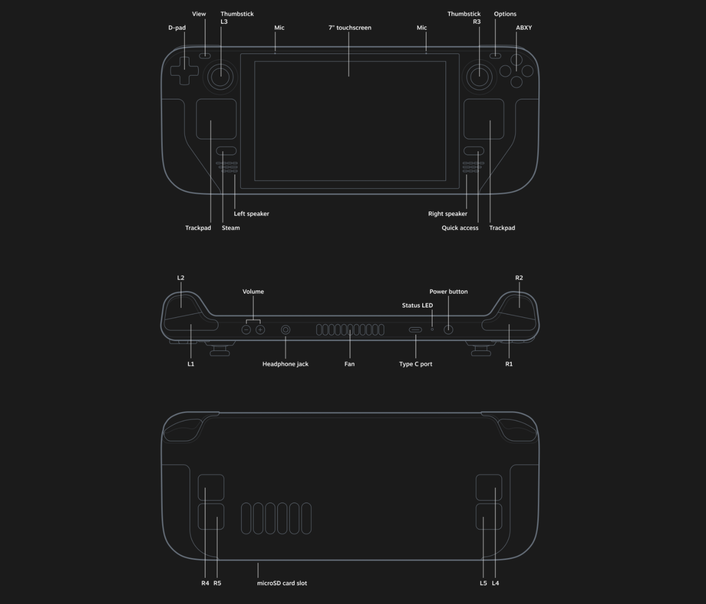 Steam Deck skilter også med integrerte kontrollere på siden av skjermen, men disse er ikke avtagbare. Nedenfor kontrolleroppsettet er to trykksensitive haptiske berøringsflater, som trekker tankene tilbake til Steam-kontrolleren fra om lag 5 til 10 år tilbake. Det er også en gyrosensor på plass som registrerer seks akser.