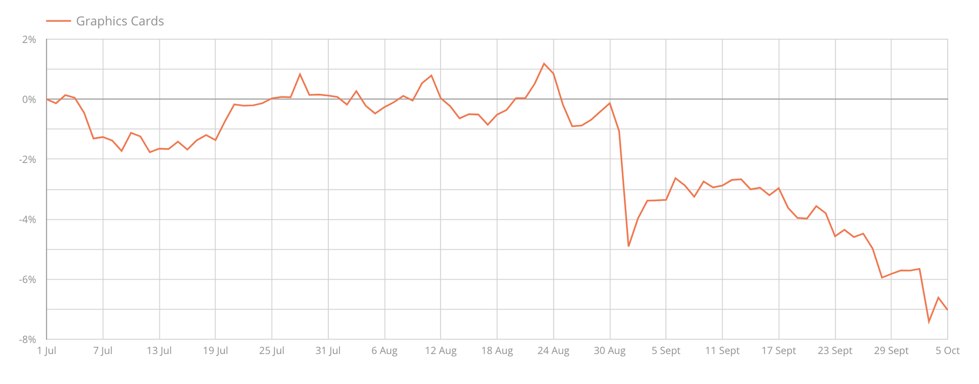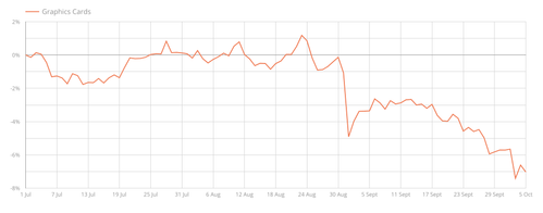 – Prisane på skjermkort har no starta ei søkkande trend. Ut ifrå grafane våre ser ein at det skjedde eit skifte ganske nøyaktig 1. september. Då gjekk prisane ned fem prosent, og har fortsett nedover til sju prosent no i oktober, samanlikna med prisen 1. juli, seier Vittersø.