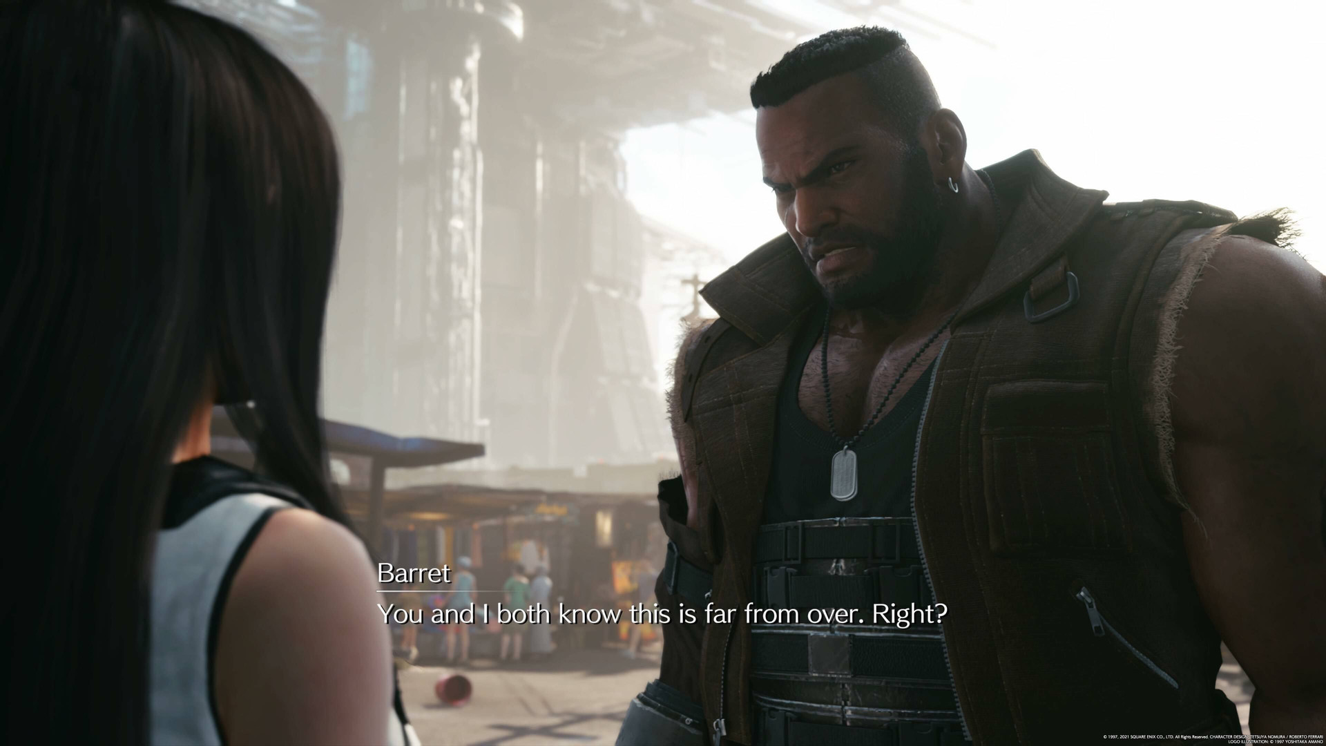 Samtidig ødelegger det noe av det bedre ved Intermission – øyeblikkene hvor Sonon og Yuffie har ordentlige samtaler om forholdet mellom Wutai og Midgar, bakgrunnsfortellinger hvor vi får vite om Sonon og hans motivasjoner, og rett og slett Final Fantasy VII som et i utgangspunktet relativt jordnært eventyr. Jeg har ikke peiling på hvor «serien» kommer til å gå neste gang, men noe som frustrerer er at den nye «slutten» tar fra oss følelsen av å slippe ut av Midgar selv, for nå blir vi servert gjennom en egen filmsekvens gjengen som tusler langt vekk fra byen.